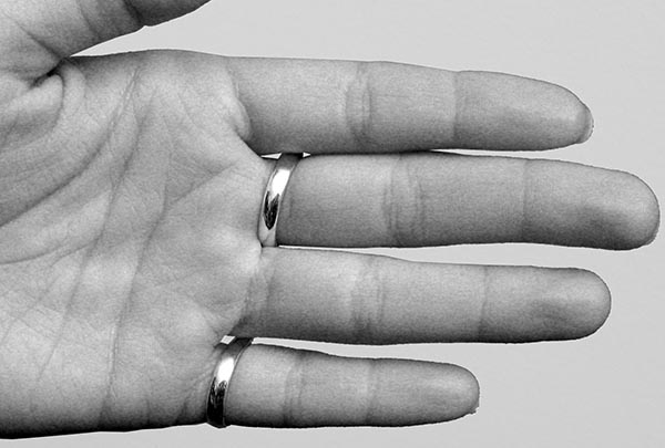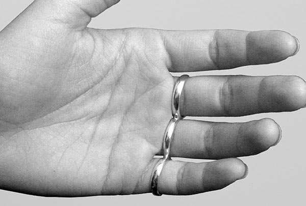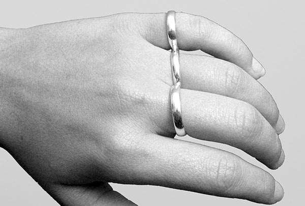 Use the SilverRing™ 2½ Buddy Ring to align MP joints. The 2 ½ BR has two rings connected by a one-half ring. It is most frequently used to prevent abduction or scissoring of fingers, to align fingers that are crossing or for an extension lag. The splint is similar to a yoke splint to help with sagittal band issues. This type of deviation may arise following trauma, post polio or from lax ligaments. The half ring can be worn under the finger to correct an extension lag or on top of the finger to act as a PIP extension assist. The half ring can be requested at 3 depths: Standard depth, Half depth and Full depth.