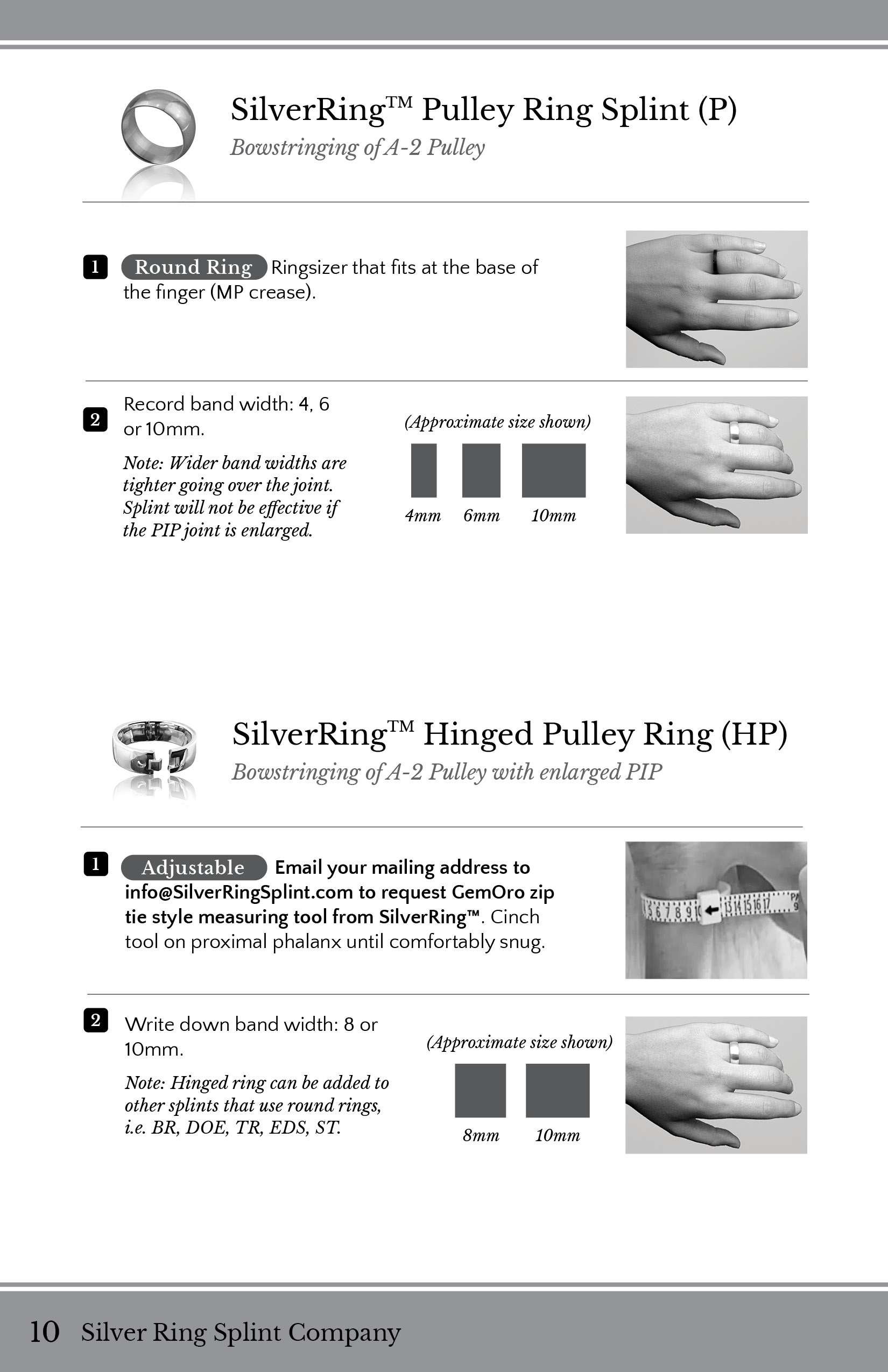 Use the SilverRing™ Pulley Ring Splint to manage bowstringing at the A-2 pulley. To determine the width of the ring, measure proximal to the PIP volar crease to allow full flexion. Pulley Rings are available in a variety of widths: 4, 6 and 10 mm (10 mm width costs more). If one of the standard SilverRing™ Pulley Ring Splints will not fit tight enough due to a large PIP joint, look at the SilverRing™ Hinged Pulley Ring.
